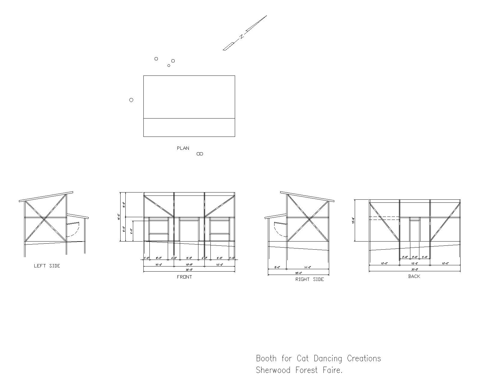 We chose a spot that was not far from the entrance, is partway up the hill, and is on the way to the children's area and restaurants. We chose a booth that was 20' x 30' and were given the booth number of 309. Well, okay, that number changed a couple of times, but it ended up as 309. We hurried home and began to design our building. We wanted something that looked period, of course, and we decided on a design with a high roof and a sleeping loft. The original design looked like this: